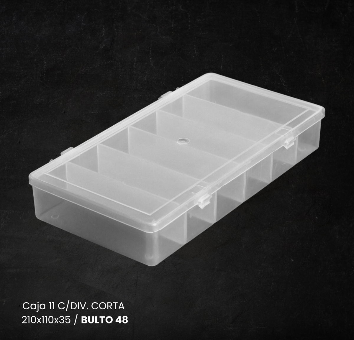 Cajas fabricadas en Polipropileno Random de 1° calidad, con tapa bisagra y 6 divisiones horizontales.
