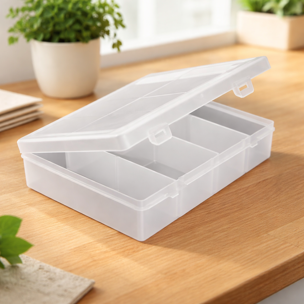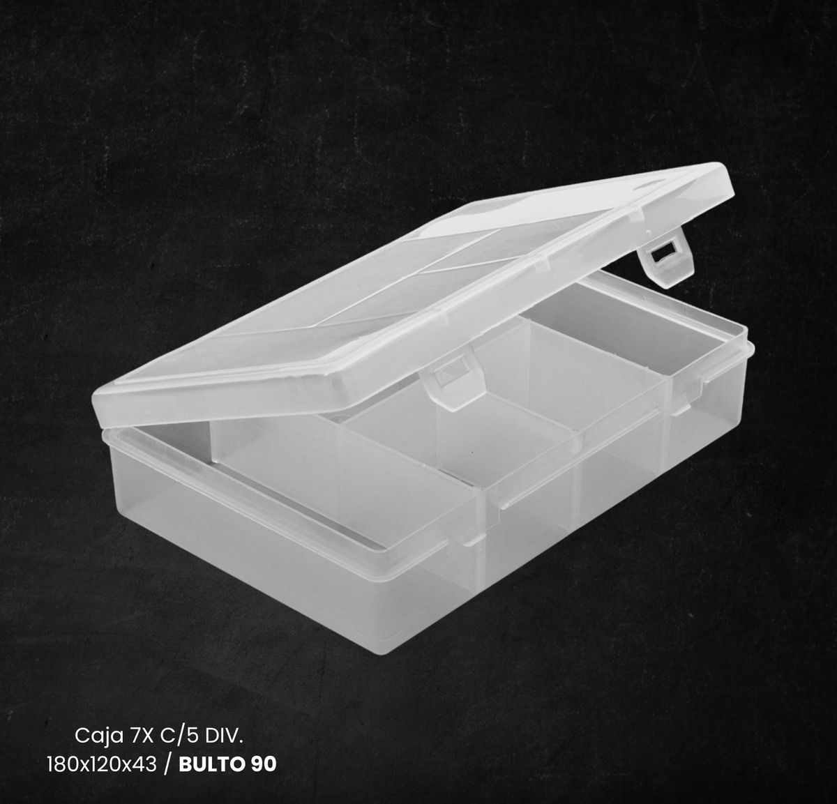Cajas fabricadas en Polipropileno Random de 1° calidad, con tapa bisagra y 5 divisiones desiguales fijas.