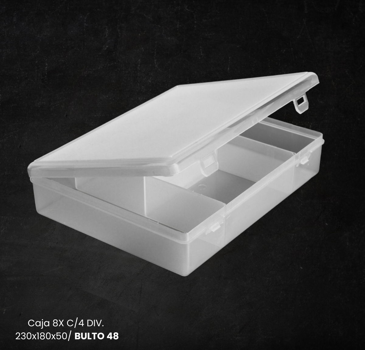Cajas fabricadas en Polipropileno Random de 1° calidad, con tapa bisagra y 4 divisiones fijas.