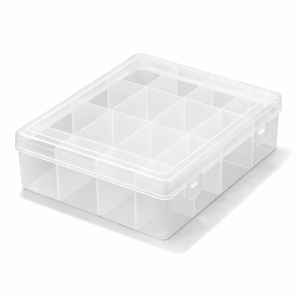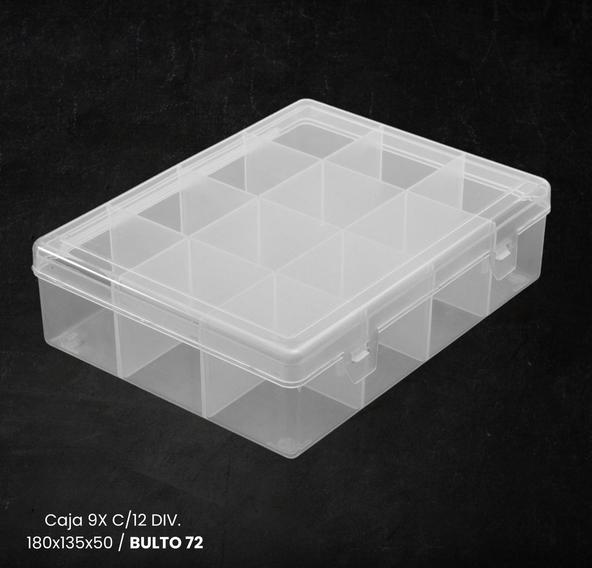 Cajas fabricadas en Polipropileno Random de 1° calidad, con tapa bisagra y 12 divisiones fijas.