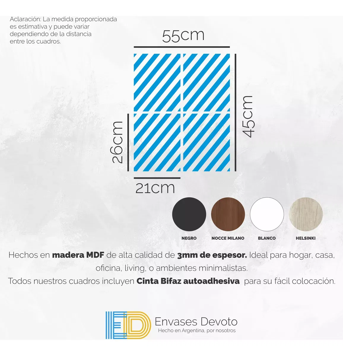 EN EL TITULO O EN LAS IMAGENES INDICAN LAS MEDIDAS. Cuadros modernos decorativos, hechos en madera MDF de alta calidad de 3mm de espesor. ideal para hogar, casa, oficina, living, o ambientes minimalistas. - Incluye Cinta autoadhesiva doble faz de alta resistencia, para pegar directo en la pared. - Colores disponibles: NEGRO, BLANCO, NOCCE MILANO (Marrón)