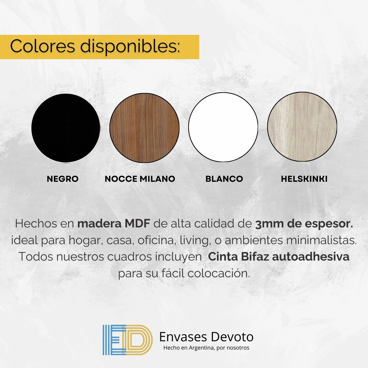 EN EL TITULO O EN LAS IMAGENES INDICAN LAS MEDIDAS. Cuadros modernos decorativos, hechos en madera MDF de alta calidad de 3mm de espesor. ideal para hogar, casa, oficina, living, o ambientes minimalistas. - Incluye Cinta autoadhesiva doble faz de alta resistencia, para pegar directo en la pared. - Colores disponibles: NEGRO, BLANCO, NOCCE MILANO (Marrón)