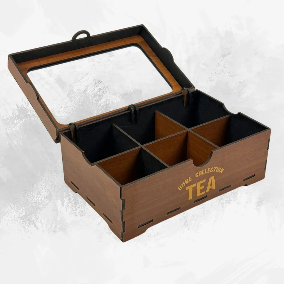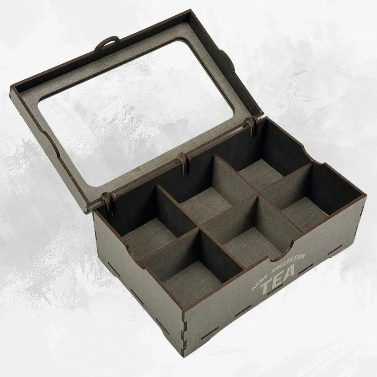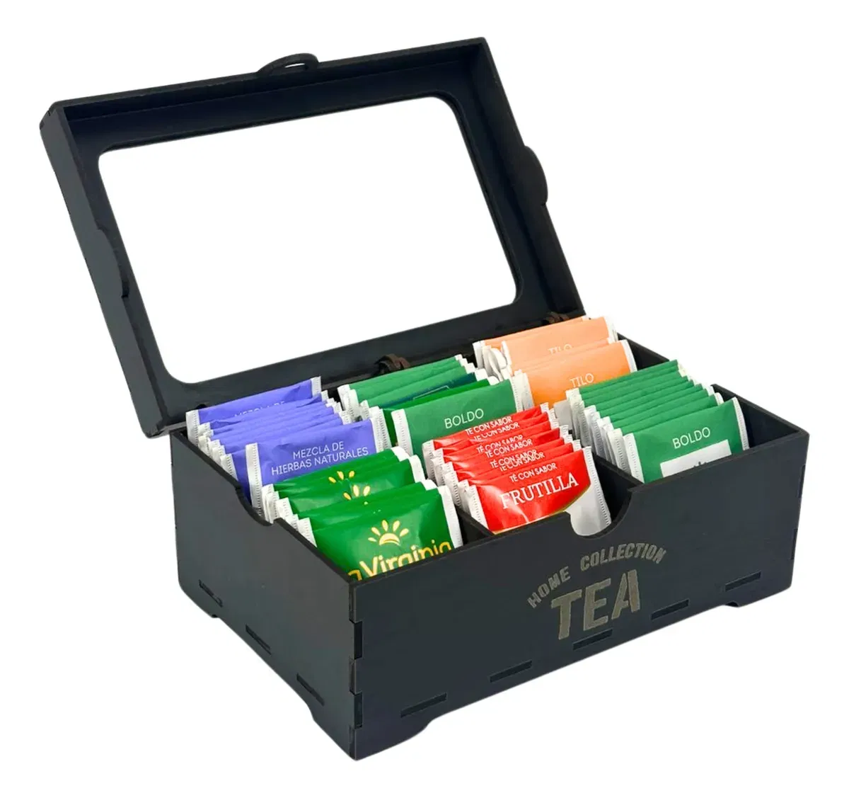 - Cantidad de divisiones: 6 - Medidas: 22cm de largo x 14,50cm de ancho x 10cm de alto - Material: Madera 3mm (MDF) en varios colores - Tapa: Plástico PET transparente (simil vidrio)