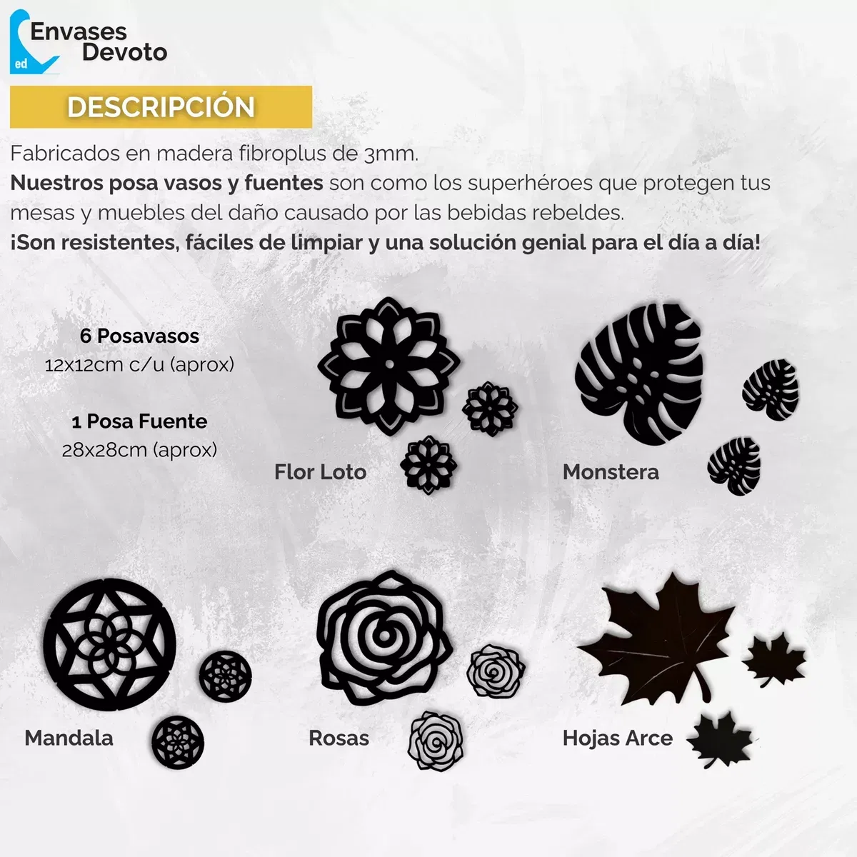 Posa vasos: 12x12cm x 3mm de grosor.